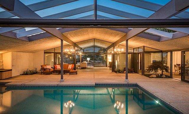 Mid-Century Modern Designed and built by renowned Cliff May. Custom built aesthetically designed 4 BR + 3.5 BA home. A true architectural masterpiece showing vaulted open-beam ceilings, and a seamless flow for both indoor and outdoor living. The easy transition between spaces is created by walls of glass and sliding glass doors that open to allow easy access to the indoor/outdoor pool, fire pit, gazebo, and side patios. The living room, formal dining and wide open kitchen areas are well lit with natural light and are perfect for entertaining. Relax in the master suite w/ fireplace, seating area, and direct access to private patio. Multi-use room can be converted to a study, den, or library. Home is approximately 5099 sq. ft. including 1,500 sq ft indoor/outdoor pool area.