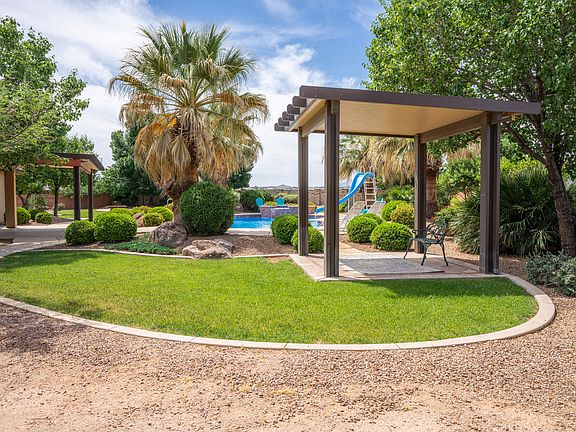 This home has it all!! Backyard paradise! Relaxing atmosphere inside and out, pool with slide, hot tub, putting green, horseshoe pit, basketball court, pergola, large covered back patio. Over ½ an acres with space to build a detached garage/casita or RV parking. Beautiful landscaping with palm trees, fruit trees, garden area, very nice stucco hobby shed with tile roof. Amazing views of the mountains & the Red Cliffs Edifice in a gated community. Superb location near excellent schools. Excellent floor plan, huge storage room off kitchen, epoxy garage floors, extra deep 3rd car garage and so much more. Occupied, shown by appointment only. *All information is deemed reliable but not guaranteed, buyer to verify all.