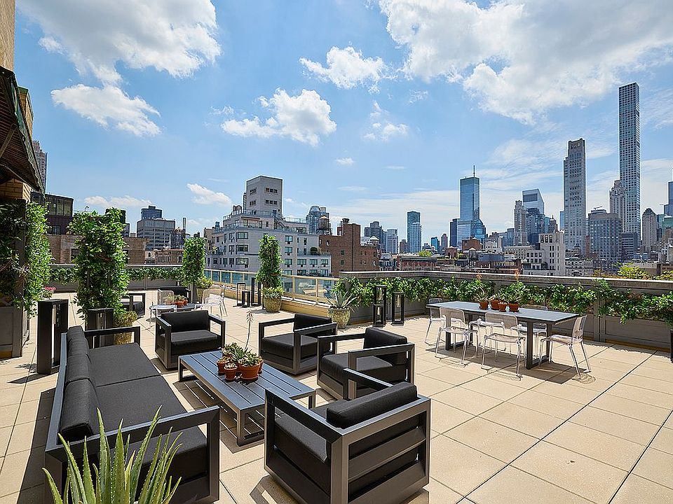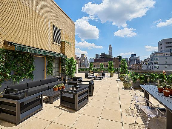 Inside, glamorous style meets thoughtful design. The expansive living and dining areas flow effortlessly across wide-plank white oak floors, illuminated by recessed Element lighting and anchored by a custom backlit onyx bar-a striking centerpiece for entertaining. The open-plan layout extends naturally to the vast terrace through 3 sets of French doors. This a truly rare Fifth Avenue sanctuary with endless possibilities for al fresco dining, lounging, and gatherings under the city skyline.