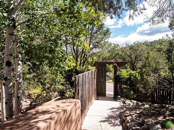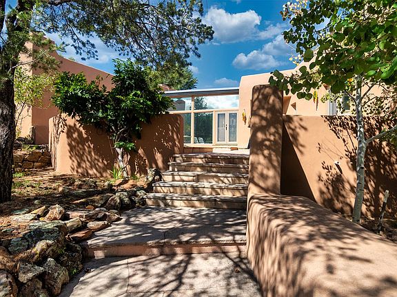 HIDDEN GEM IN THE OUTSTANDING EL CANON NEIGHBORHOOD - 4 BED | 5 BATH | 2 CARG - On a cul-de-sac tucked into the ridge top of a private canyon enclave in the upper east heights of the Cerro Gordo + Upper Canyon Road corridor, this 4 Bed, 5 Bath home boasts beautiful north east views of the Sangre de Cristos foothills and the Jemez Mountains. Designed by Robert Nestor the pueblo architecture and regional style make you feel right at home with the natural surroundings. This home is a true nest high in the foothills. A beautiful and dramatic entry features a calming fountain. Large vigas and beautiful decking, latillas, and split cedar grace the ceilings. Floor to ceiling glass doors on either side of the great room open this home up to the sky. With 4 bedrooms featuring en suite baths, this is a great home for hosting family or friends. This home has a wonderful layout with great separation of guest rooms from the main suite. One of the bedrooms is wonderfully situated to double as an office and home gym. Mature trees and tiered rock garden beds make for privacy and a wonderful outdoor experience. Traditional Talavera tile kitchen and baths bring warmth and craft to this pueblo charmer. The kitchen is complete with breakfast nook, desk center, large kitchen island, hardwood cabinetry and walk-through pantry. The outdoor covered portal overlooking the hillsides is perfect for morning coffee or grilling dinner. Saltillo floors, skylights, and wood burning fireplaces bring comfort and brightness. A wonderfully handmade New Mexican tin chandeliers and sconce enhance the entry and guest wing. Sandstone patio and garden paths merge beautifully with the landscape, and a hot tub deck provides relaxation for soaking in the sun. While providing great privacy this home is only a short drive through the beautiful canyon into town and makes daily outings easy and pleasant. Don't miss the chance to own this slice of traditional pueblo living with views on the eastside!