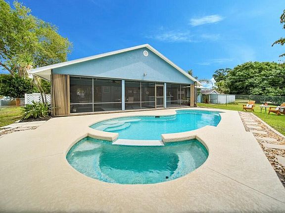 Welcome to your dream home in the heart of Palm City with NO HOA! This charming CBS construction residence features 3 bedrooms, 2 bathrooms, and a spacious 2-car garage. Enjoy the privacy of a fully fenced backyard and the luxury of a resurfaced pool, perfect for relaxing or entertaining under the Florida sun. The home offers thoughtful upgrades throughout, including a brand-new metal roof, accordion hurricane shutters, and fresh interior paint. The open-concept layout is enhanced by vaulted ceilings, while the kitchen features newer stainless steel appliances and a convenient pass-through window to the screened patio for effortless indoor-outdoor living. Located close to top-rated schools, shopping, dining, and easy highway access, this home blends comfort, convenience, and freedom. Call today to schedule your private showing!
