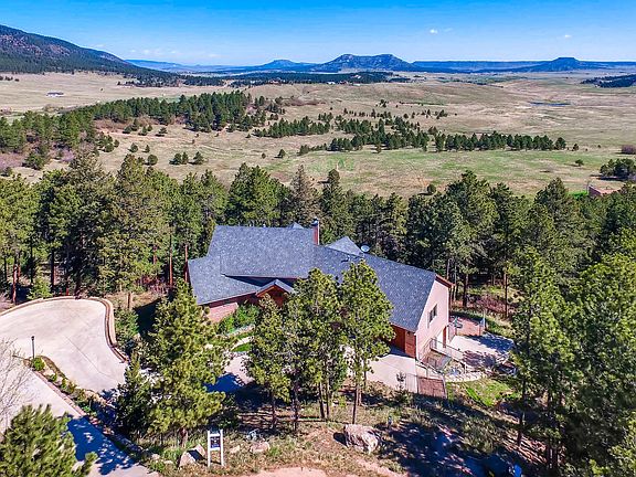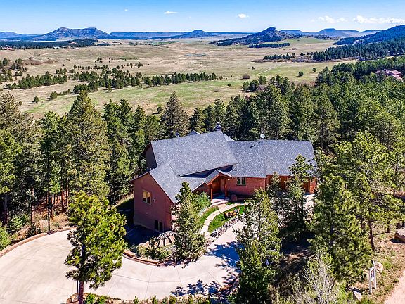This gorgeous custom brick & stucco rancher is in the quiet area of Spruce Mountain Estates, situated on 2.08 acres with tall pines and beautiful mountain views. Tile entryway leads into the two-story great room with hardwood floors, two-side stone fireplace with wrap-around mantel & built-ins, beamed ceilings, large wall of windows to bring in views and natural light. Gourmet kitchen with granite counters, center island with pendant lighting, double oven, pantry, gas range top with designer tile backsplash, stainless steel appliances, planning desk and sitting nook in front of fireplace. Dining area features beautiful views with a walk-out to a huge composite deck, perfect for entertaining. Master retreat features; a gas fireplace, vaulted ceilings, 5 piece bath with spa tub including a fireplace and walk-in closet. Completing the main level is a half bath with designer finishes. Upper level loft is gorgeous with wood ceiling and floors and overlooks the spacious great room below. Lower level walk-out features; a family room with wet bar that includes full size refrigerator, granite counter with tile backsplash, laundry room with cabinets, sink and additional counter for folding. Completing the lower level is an additional bath and three additional bedrooms with one featuring a large sitting area. You will enjoy true Colorado living from the peaceful setting this home has; close to the trailhead for hiking and its only a short drive to Palmer Lake and Monument for fine dining and shopping.