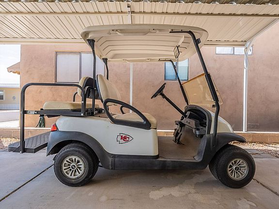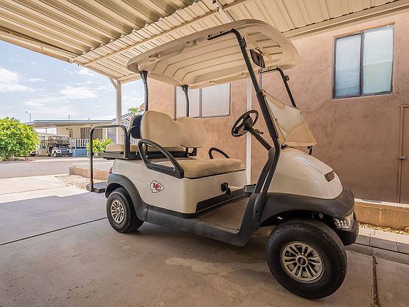 More spacious than photos show! Furnished home includes a golf cart with 2024 batteries. Includes a beautiful covered deck with loads of storage underneath. Huge second living room extension with enough space to easily create a 2nd bedroom. Includes two closest and a 1/2 bath with full sized washer and dryer. Cold AC throughout the home. Bedroom has a queen bed and ample storage. Full bath has a shower/tub combo. Both sofas have pullout sleepers. Neutral laminate flooring throughout. Open kitchen includes dishwasher, oven, microwave and fridge. Built-in hutch with glass doors in dining area. Skylights keep home bright and airy. Extended carport with awning and exterior shed. Short walk to pool, recreational hall and other Viewpoint amenities. Come tour this lovely home in Arizona's best resort golf retirement community!