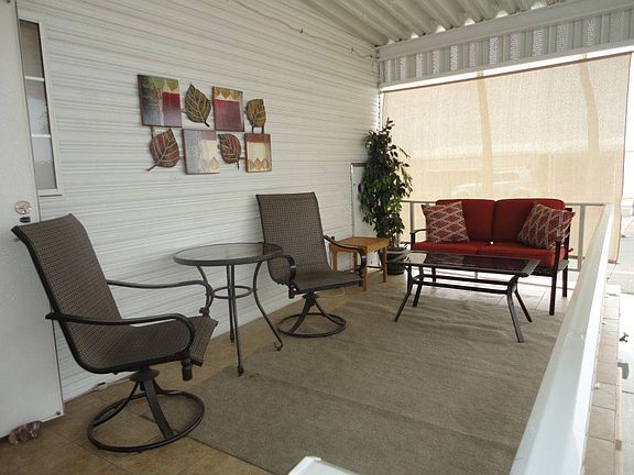 Spacious 1 bedroom, 2 bath home with bonus room! Ideal south facing home has both north & south decks and sits in a prime location. No west or south neighbors! Short walk to pools, offices, activity centers, and ballroom. This 1995 Cavco has been updated and comes furnished, so simply move in and enjoy Viewpoint's unparallelled amenities. Roof will be 3 years old in January. Blinds throughout. Large sunny kitchen with oven, microwave, dishwasher a connecting dining room with pocket doors. Main bedroom has a queen lift-and-store bed, built-in dresser & large closet. Guest bedroom has beautiful built-in bunks & a full size washer and dryer. Large living room includes a sofa sleeper, 60" flat screen TV, and an electric reclining leather loveseat with USB ports & phone charger. Two full baths: one with a walk-in shower and the other with a shower/tub combo. Relax on the covered north patio with deck furniture. 3 storage sheds, tools, and 2 refrigerators inlcuded! Two hot water heaters to keep you & your guests comfortable. Covered epoxy coated carport with 3 under-deck sliding storage drawers. Delicious seedless orange tree. Home also includes a Weber Gas Grill, his & hers bikes, 3 TVs, a set of golf cubs & 2 pull carts. Cruise to any of the 4 resort pools or 13 pickleball courts in the updated 1998 Club Cart for an additional 3k. A 2014 Scion with only 62k miles is also available. (Reach out for details.) Must tour to truly appreciate this smart layout!