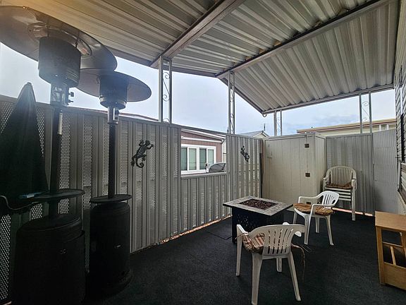 This spacious 1BD 1.5BA home offers expansive indoor and outdoor living spaces, fully furnished and complete with a golf cart. Inside, you'll find updated flooring, vaulted ceilings, a spacious living room with a hide-a-bed couch, a half bath, and a guest closet. The main bedroom features a queen-sized bed with ample closet space and built-in storage. The open floor plan is filled with natural light from numerous windows. Outside, you'll enjoy large front and back covered patios, perfect for outdoor living. The storage shed doubles as a laundry room, offering plenty of storage along with an extra fridge and freezer. The foam roof was recently recoated, and a new HVAC system was installed last year. Situated in the Viewpoint Golf Resort 55+ community, residents have access to a wide array of amenities, including two golf courses, four pools, pickleball, tennis, softball, live entertainment, and more. This home truly has it all!