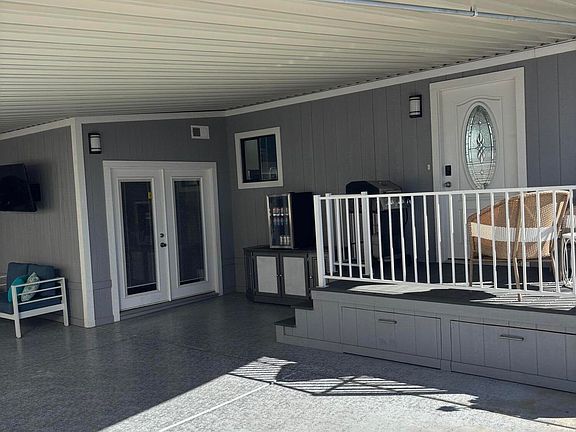 Move on outdoors to a well furnished living space under the existing carport with patio heater and pivotal wall mounted tv. Privacy curtains provide extra privacy when needed. Enjoy the new composite deck with storage drawers. The carport has been extended with light filtering panels for extra parking or living space, you decide! Newly installed modern pavers in front of home and alongside extended patio area. Comes with entertainment storage cabinet along with bar fridge. The storage shed is also included with the sale of this home.