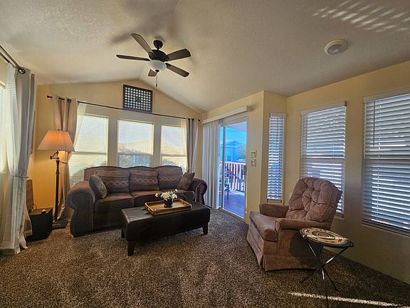 This home is a true delight inside and out! It features an open floor plan with vaulted ceilings and an abundance of natural light, complemented by fresh interior paint and extensive storage throughout. Meticulously maintained, the exterior offers a beautiful deck leading to the front door, a huge, covered patio& gazebo, an enchanting garden, a large storage shed, a BBQ area, and a super-sized outdoor TV and living room. The HVAC system is only three years old. The property is furnished inside and out, with golf cart parking and a tandem carport. Located in Viewpoint Golf Resort, a 55+ neighborhood, this home provides access to two golf courses, pools, spas, tennis courts, pickleball courts, a baseball field, workout facilities, and more. Priced for immediate sale!
