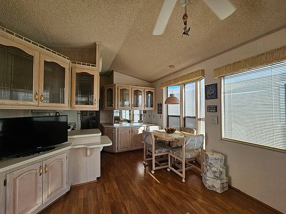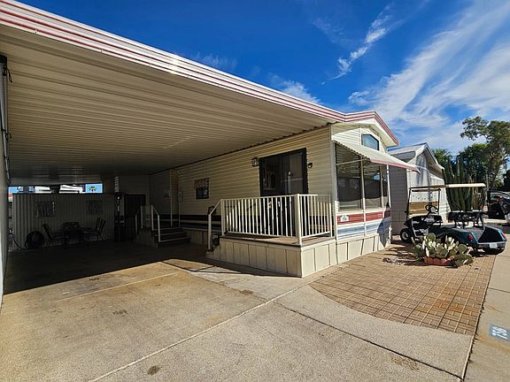 This budget-friendly 1BD/1BA home boasts a spacious covered carport with a large storage shed and a versatile guest/hobby room. Featuring an open floor plan and vaulted ceilings, the home offers an abundance of storage options. The main bedroom includes his and hers closets, while the full bath features a tub shower. Numerous windows throughout the home invite ample natural light, creating a bright and welcoming atmosphere. The covered, shady patio with a privacy wall runs the length of the carport, complemented by a sunny front patio. Situated in the Viewpoint Golf Resort 55+ community, residents have access to a variety of amenities including two golf courses, four pools, pickleball, tennis, softball, live entertainment, and more.