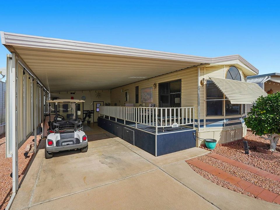Beautiful 2-bedroom home with huge outdoor living space & an INCLUDED 2013 Yamaha golf cart! Spend all winter outside on the beautiful, covered deck with loads of storage underneath, a new BBQ, dining table and chairs. 2nd bedroom has its own private entrance off this fabulous outdoor living space. Guests in the 2nd bedroom will enjoy a queen bed, 1/2 bath, flat screen TV, toaster oven, and mini-refrigerator. Washer/dryer/shower hookups are also located in 2nd bedroom. Main home is made comfortable with Lazy Boy sofa sleeper and comfy recliner chair. Galley kitchen features light cabinetry with brushed gold & ivory hardware, dinette set, oven, microwave, and refrigerator. Full bath has a shower/tub combo. Primary bedroom has queen bed with extra-large closet and storage. All furnishings are included. New roof in April 2025. Over-sized shed attached for storing all those extras. 2005 Ford Explorer XLT 7-seater negotiable. Short walk to pool, recreational hall and other Viewpoint amenities. Come tour this lovely home in Arizona's best resort golf retirement community!