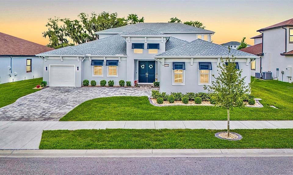 Welcome to your dream home at 8700 Sanders Tree Loop, Wesley Chapel, Florida! Nestled in the serene surroundings of Epperson Ranch, this stunning property offers luxury living at its finest. Boasting 6 bedrooms and 4.5 bathrooms sprawled across 4637 square feet, this home provides ample space for comfortable living. Situated on over a quarter-acre of land, you'll enjoy the tranquility of backing up to preserved woods with views of King Lake. As you arrive, you'll be greeted by a paved driveway leading to a spacious 3-car garage equipped with a Tesla charging station, offering convenience and plenty of storage space. Step inside to discover an open floor plan designed for both relaxation and entertainment. The heart of the home is the gourmet kitchen, complete with top-of-the-line appliances, sleek countertops, and a convenient island for meal preparation. The adjacent living area features ample natural light from extra large windows and sliding glass doors equipped with automatic remote control electric blinds perfect for cozy evenings with loved ones. Escape to the luxurious primary suite, featuring an extra-large walk-in closet and a spa-like ensuite bathroom, offering a serene retreat after a long day. Upstairs, a balcony overlooks the picturesque views of King Lake, providing a peaceful spot to unwind and soak in the beauty of the surroundings. Built in March of 2023 by Biscayne Homes, this home showcases quality craftsmanship and attention to detail throughout. The Bismark 3 model offers timeless elegance and sophistication, making it a true gem in the neighborhood. Located in a gated community in Epperson Ranch, residents have access to a wealth of amenities, including the renowned Epperson Lagoon and the brand new Lagoon at Mirada, the largest lagoon in the nation. Plus, you'll enjoy the convenience of being just 4 minutes away from Publix, 10 minutes from I-75, and 10 minutes from Tampa General Hospital Urgent Care in Wesley Chapel. Don't miss your chance to own this exceptional property in one of Wesley Chapel's most coveted neighborhoods. Schedule your private showing today and start living the lifestyle you've always dreamed of!