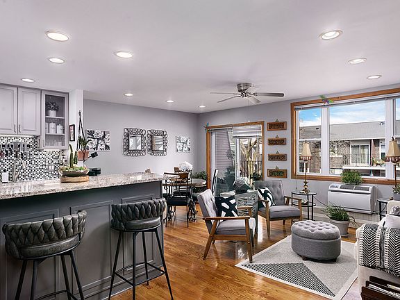This elegant top-floor corner unit offers a harmonious blend of modern sophistication and timeless charm, boasting 1,000 square feet of meticulously designed living space. Step inside to discover an open floor plan that seamlessly connects the dining and living room to a gorgeous kitchen, adorned with stainless steel appliances, granite countertops, and a breakfast bar.. The kitchen's thoughtful design is perfect for both everyday meals and entertaining guests. The residence features two spacious bedrooms, each offering generous closet space, including a walk-in closet for your convenience. The stunning bath and additional half bath are tastefully updated, providing a serene retreat for relaxation. The expansive hardwood floors lead you to a large balcony, where you can enjoy peaceful moments and captivating views. Additional amenities include an elevator for easy access, and common storage for your belongings. The building offers laundry facilities, ensuring convenience at your fingertips.