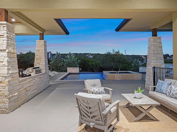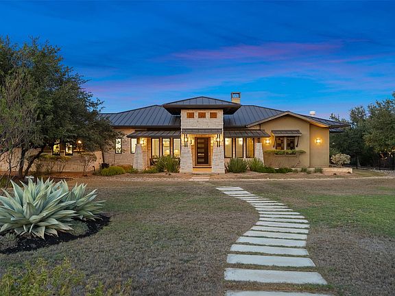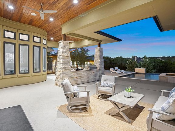 Welcome to a haven of Hill Country living in a gated community on 1.3 acres, where contemporary design and nature unite in perfect harmony. This exceptional estate includes a single-story 3,816 sq ft custom residence w/ oversized 3 car garage, plus a newly completed ~1,600 sq ft climate-controlled garage + office addition—offering 5+ total garage bays with option for lifts, ideal for a car enthusiast or creative professional. Capturing panoramic views, this one-of-a-kind custom home blends natural materials with refined modern architecture. The grand entry leads to graceful curves, wood accents, soaring ceilings, lighted niches, and a striking fireplace, creating an ambiance of serene sophistication. An open layout includes multiple living & dining areas. Walls of windows and expansive sliding doors invite the scenic outdoors in. Backing to a greenbelt, the private backyard retreat features a 2023 Keith Zars heated pool & spa, outdoor kitchen, & sprawling covered patio. Chef’s kitchen showcases dual islands, a breakfast bar, built-in Thermador appliances (double ovens, coffee maker, ice maker), a butler’s pantry w/ wine fridge, & alkaline faucet. The primary suite opens to the pool and views, with a spa-inspired bath offering a walk-in shower, freestanding tub, triple vanities, & dual closets. Additional highlights include a built-in sound system, EV charger, central vacuum, whole-home water purification, & smart home automation. Sustainability and security shine with a rainwater collection system, solar panels with Tesla Powerwall backup, custom screened doors.  The new detached Garage + Office Retreat features showroom lighting, a 2-car lift-ready bay, EV plugs, kitchenette/lounge, soundproof room, offices, full bath, and workshop area—blending luxury with precision and performance. Set within the prestigious Belvedere community, residents enjoy a clubhouse, resort-style pool, lazy river, fishing pond, trails, and nature preserve—Hill Country luxury at its finest.