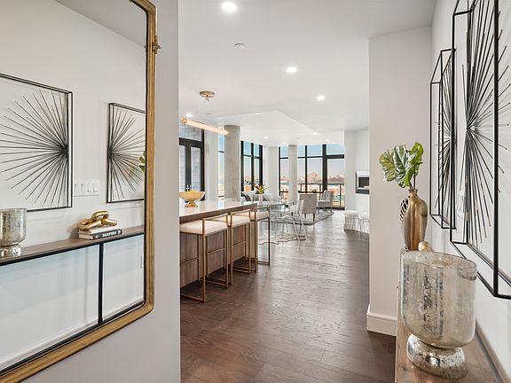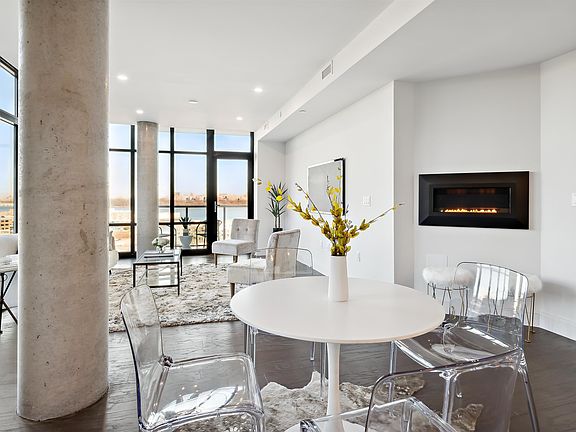 Ideally situated between Edgewater and Weehawken with stunning views of the Hudson River and Manhattan skyline, each of Solaia's spacious east-facing residences features expansive, double-pane windows, dark espresso flooring, custom closets and living rooms with gas fireplaces. Chef-inspired kitchens boast custom Italian cabinetry, SapienStone countertops with waterfall islands, and stainless steel GE Café Series smart appliances. En-suite five-fixture baths flaunt Seedwood tile feature walls and freestanding tubs for a spa-like experience. Smart lights, thermostats, and Latch keyless entry, along with an in-home, full-size washer and dryer, make life here as convenient as possible. Each home includes one deeded garage parking spot with additional parking available for purchase. The 10,000 sq. ft. of amenities include a three-story wellness center with a yoga room, TRX equipment, boxing space, a steam room, sauna, rainfall shower, a Himalayan salt inhalation therapy room with infrared relaxation beds, a jetted vitality tub, and a dressing room with personalized lockers. There's also a cliffside roof deck with a custom outdoor demonstration kitchen, BBQs, dining areas, firepits, and lounge seating, along with a co-working space, resident lounge with fireplace, billiards and ping pong, a demonstration and event space, and a dog run. Solaia is located in North Bergen, just moments away from the George Washington Bridge, Lincoln Tunnel, Hudson Bergen Light Rail, and NY Waterway Port Imperial Ferry Terminal, as well as near an abundance of shopping, grocery and nearby attractions. Photos are from a similar home that has been staged. HOA fees paid up to August 2025!!
