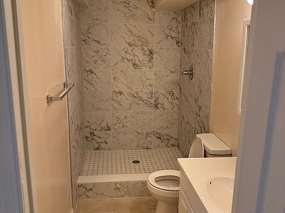 Newly renovated bathroom with brand-new tile, toilet, and shower