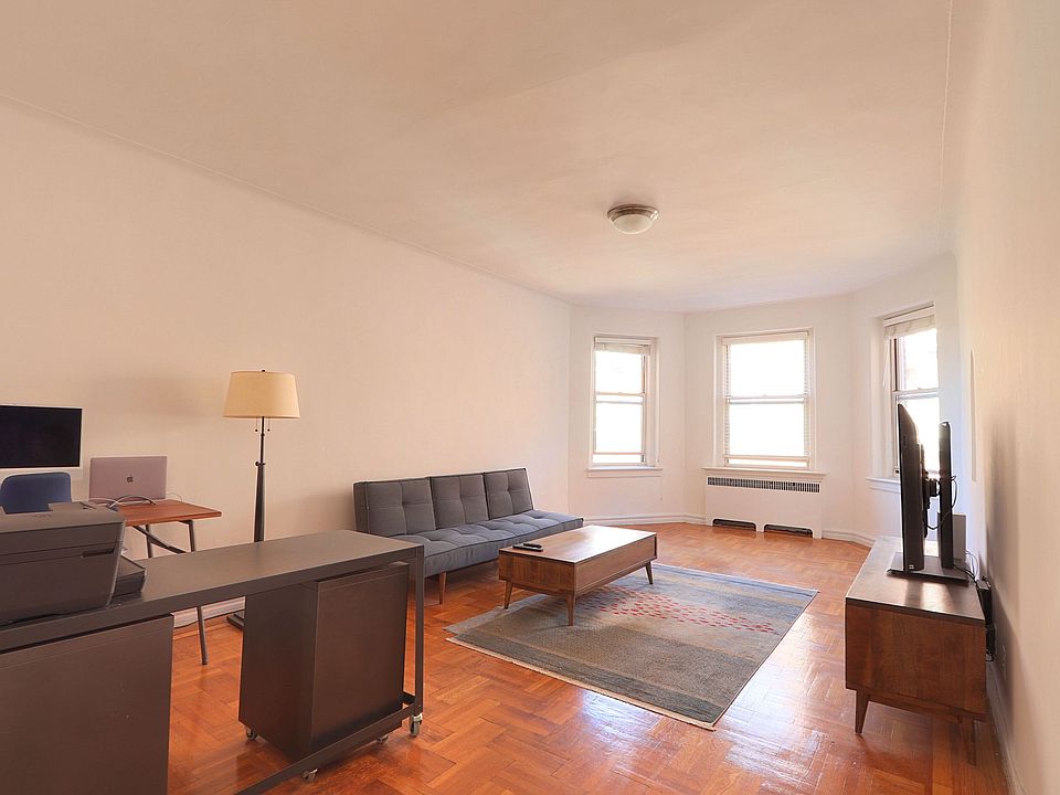 This one-bedroom apartment is located in a well-maintained co-op featuring two porters and a full-time super. The unit sits on the 5th floor and faces Shore Road. Upon entering, a long hallway with two side-by-side closets offers a warm and practical welcome to the home. All rooms lead off the foyer, creating a thoughtful and functional layout. The living room features three stunning windows that fill the space with natural light and accentuate its charm. Spacious enough to serve as both a living area and home office, the room's arched details are a classic hallmark of pre-war construction. The bedroom comfortably fits a king-sized set and includes two closets for ample storage. The bathroom also features a convenient linen closet. This is a dog-friendly co-op. Standard co-op rental approval applies. The apartment can be available between November 1st and December 1st, depending on the approval timeline.