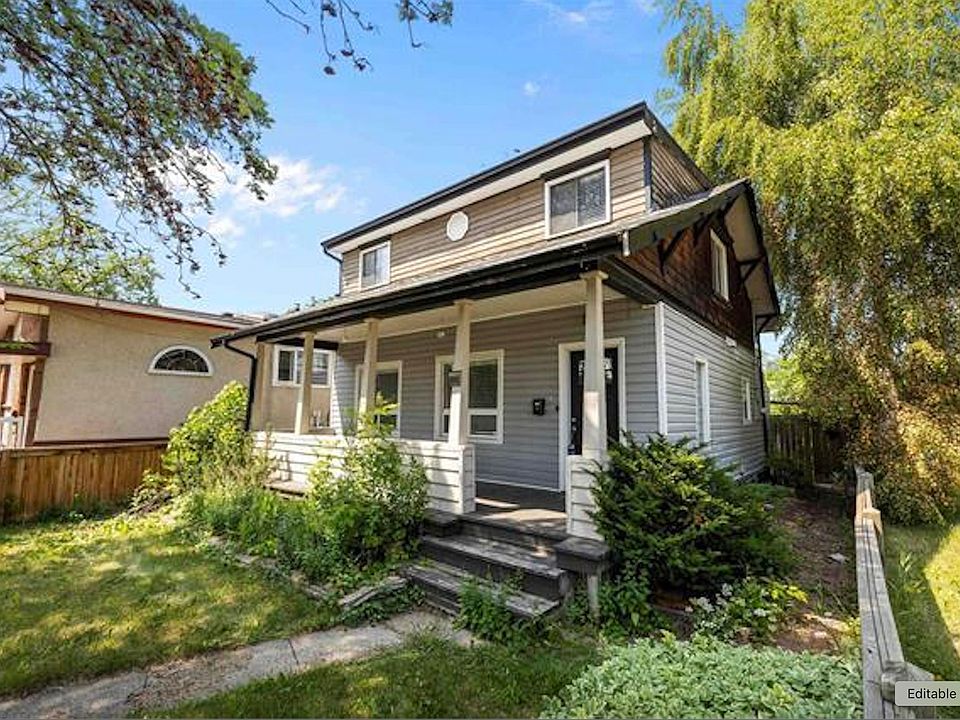 Discover the storybook home you've been dreaming of in a charming neighborhood surrounded by mature trees. Perfect as a cozy residence, an AirBNB opportunity, or a smart investment. Investors can buy and hold, renting it out while planning for future redevelopment. The corner lot offers design flexibility—potential to build up to a 4-plex. A welcoming front porch shaded by a large tree sets the tone for peaceful summer days. Inside, a warm wood-burning brick fireplace, wood floors, and classic white wainscotting create timeless charm. The updated eat-in kitchen provides plenty of cabinet space, while the main bath features a large shower and standalone tub. Upstairs, you’ll find two spacious bedrooms. The partially finished basement offers great storage or a cool flex space. Enjoy outdoor living on the large back deck. Major upgrades in 2019 include siding, shingles, carpet, and paint. 100-amp electrical service. Steps to LRT, U of A, river valley, Folk Fest grounds, and more!
