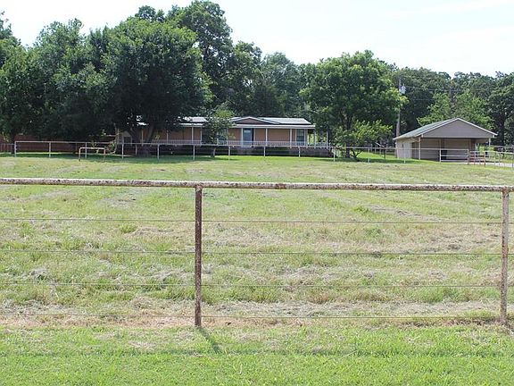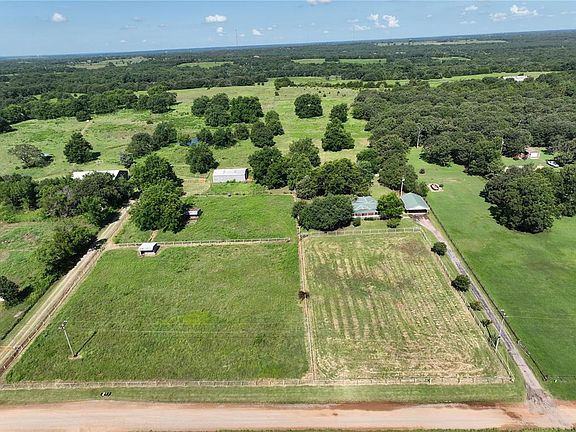 Property is 29.5 acres, mostly cleared, with Bermuda/native grass for grazing, cross fenced for easy rotation, 3 loafing sheds. Easily supports 6-8 horses and/or a dozen steers. Pipe and cable fence in front of house. Barbed wire for perimeter, 50’ round pen, 40’x50’ horse barn with 4 wood stalls, concrete runway, secure, heated tack room. Also Includes a 60’ by 70’ Amish-built pole barn with no interior posts -perfect for hay storage, more stalls or indoor riding arena, or could be a “grow” business, has large drive-through doors on north and south ends to pull your truck and trailer through. Pole barn has electric plugs throughout, overhead lights, with 110 & 220 and an air compressor that stays with the property. Horse barn has electricity and lights. Water spigots in both barns. Dry, in-ground concrete tornado shelter in back yard of house.