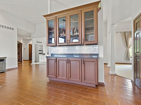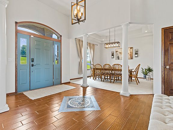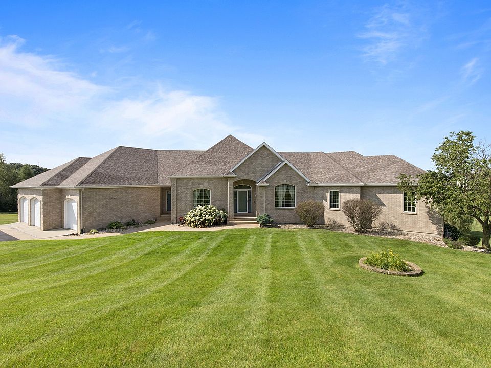 Nestled on 4.32 rolling acres, this custom-built ranch home offers over 5700 sq. ft. of luxury living space. Perfect for those who appreciate elegance and comfort, this home has it all! The spacious foyer opens to the formal living room with vaulted ceiling (currently used as a playroom) and formal dining room with tray ceiling. The kitchen is a chef's dream with a large center island, recently updated cabinets with crown molding, updated light fixtures, tiled backsplash, granite counter tops and SS appliances. The tile floors flow from the foyer into the kitchen, eating area and family room. The eating area is customized with tile, updated light fixtures and stunning views to the back yard through the three arched windows! The family room boasts of a fireplace, and door to the deck overlooking the private backyard. The primary suite features gorgeous tile, volume tray ceiling, 2 walk in closets! The primary bath boasts of custom tiled shower with new glass door, jetted tub, double sink vanity, tiled floors and flooded with natural light! Down the hall is a 1/2 bath and two additional bedrooms with a Jack and Jill full bath! Off of the family room is another bedroom and a full bath! The mud room/laundry room is just off the kitchen with access to the 3.5 car garage! The lower level offers the owner countless options with a full kitchen, massive family room, play area, a bonus room with LVP flooring, an office, a large bedroom, and a full bath. Off the family rooms is a slider out to the pergola/patio. There is access to the basement through the home and from the garage! The home also features volume ceilings throughout the main level, a whole house generator, R/O system 2023, appliances 2023. The roof was new in 2023. There are two furnaces and two CAIR units. This stunning property offers the perfect blend of luxury and functionality, providing an exquisite living experience in a serene, private setting. Don't miss your chance to own this exceptional home!