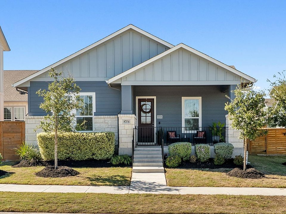 Step into this Easton Park gem—a beautifully designed home offering four bedrooms, three and a half baths, and a dedicated office (or 5th bedroom) spanning across a spacious, light-filled floor plan. A charming covered front porch sets the tone, perfect for morning coffee or evening relaxation. This residence features soaring ceilings and a well-appointed open layout that blends functionality and style. The chef’s kitchen serves as the heart of the home with quartz countertops, stainless steel appliances, a large center island, and an oversized custom coffee bar with designer lighting and abundant storage. The primary suite offers a tranquil retreat, complete with a spa-inspired bath featuring a soaking tub, separate shower, Carrera marble counters and an expansive walk-in closet. The secondary bedrooms enjoy abundant natural light and share a bath enhanced with Moen fixtures. Upstairs, a private guest suite provides flexibility as a second living area, playroom, or media space—tailored to your lifestyle. Luxury vinyl flooring throughout ensures lasting durability and modern appeal. Outdoor living is equally impressive with two covered patios and spacious yards with automatic sprinklers—perfect for entertaining, gardening, or simply soaking in a peaceful evening. Set within Austin’s vibrant Easton Park community, residents enjoy world-class amenities at The Union, including a resort-style pool, fitness center, and event space. Miles of scenic trails, neighborhood parks, and regular community events foster a true sense of connection. The newly opened 21-acre Skyline Park stands as Easton Park’s crown jewel, offering panoramic downtown views, a pavilion, splash pad, zip line, hillside slides, and shaded play areas for all ages. Conveniently located just a short walk from the elementary school, this home perfectly blends comfort, design, and everyday ease—an ideal choice for those seeking community and connection in one of Austin’s most desirable neighborhoods.