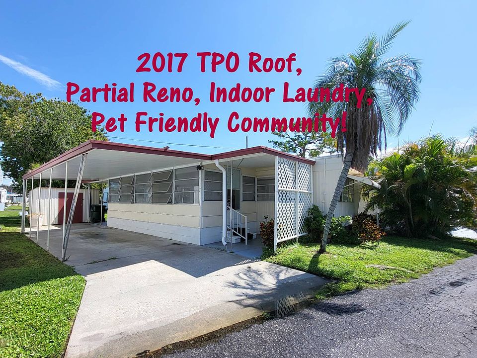 Lowest lot rent around - grab this charmer now! This fabulous 1 bedroom/1 bath plus all seasons room has been partially renovated and just awaiting your final touches! The home boasts a 2017 membrane roof with transferable warranty, a dry wood termite maintenance contract renewable yearly, newer A/C units, indoor laundry, updated kitchen cabinetry, PVC plumbing, partial LVP flooring with 13 boxes to complete the remainder of the main home, partial shiplap wall accents, a spacious master bedroom with built-in closet organization and laundry nook with washer/dryer and a spacious sun room to do with as you please! The cozy living room is lined with plenty of windows allowing sunlight and those wonderful gulf breezes to flow freely. Updated kitchen includes refrigerator, stove and microwave and there is generous storage that you won't find often plus a nice utility closet in the hallway. The bathroom has a large vanity with updated lighting, tub/shower combination and linen closet. Extra long carport will easily accommodate 2 cars and has lattice for added privacy. There is a utility shed at the back of the home for all of your extra storage needs plus room for a picnic table or some relaxing outdoor furniture. Royal Palms is an affordable gem of a community located just minutes to the white sand beaches of the Gulf, all shopping needs including grocery, pharmacy and home improvement, great restaurants and beautiful and exciting downtown Sarasota! This pet friendly community boasts a clubhouse with full kitchen, heated pool, shuffleboard courts, library, computer center and laundry facilities. Land lease (lot rent) is the lowest in Sarasota at $780 monthly which includes water, sewer, trash pickup, lawn maintenance, taxes and amenities. Buyers must be approved through the park via application with credit and background verification. Cash purchase only.