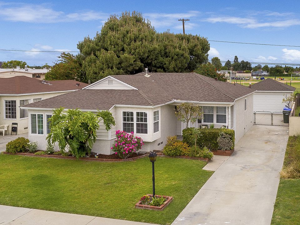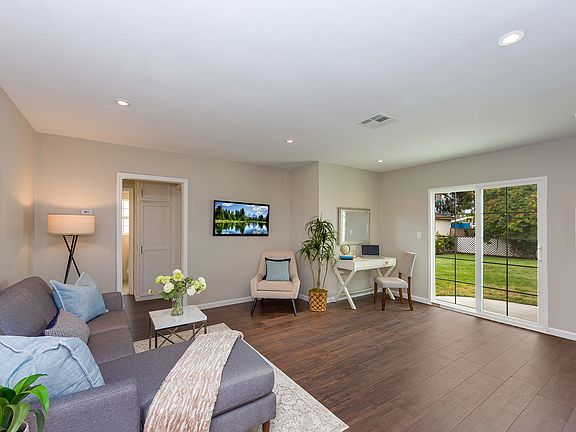 Beautiful single story remodeled home! Welcome home to this three bedroom one bathroom jewel! Home features include newer wood type laminate flooring and custom paint through out. Updated light and bright kitchen with new stainless steel appliances and quartz counters . Custom paint completed interior and exterior. LED lighting in kitchen and recessed lights in living room area. Newer slider doors and energy efficient windows. Newer AC and furnace with new ducting . Large back yard with patio for entertaining. Nice detached garage and long driveway for parking. Close to shopping, freeway access and schools. Must see!