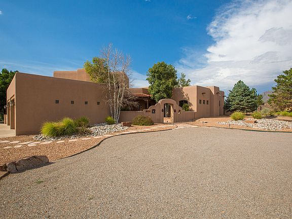 Stunning North ABQ Acres property! This luxurious home spans 4251 sqft, with 4 bedrooms/ possible 5 bedrooms, and 3.5 baths and sits on .89acre lot. Every detail was addressed, venetian plaster, wood beamed ceilings, knotty alder cabinets, travertine tile flooring, and upscale amenities. A car collectors dream home, an 8 car garage, room for an RV on site and additional parking spaces.The detached four car garage has an office/game room attached. A spacious yard with covered patios to sit and take in the beautiful views of the Sandia Mountains. Room to add a pool with easy backyard access.An amazing price for this absolutely gorgeous home!