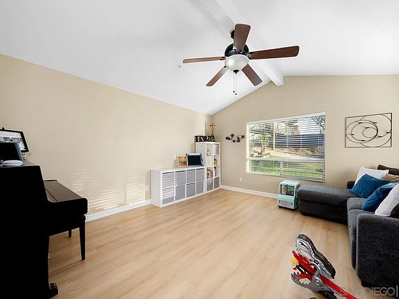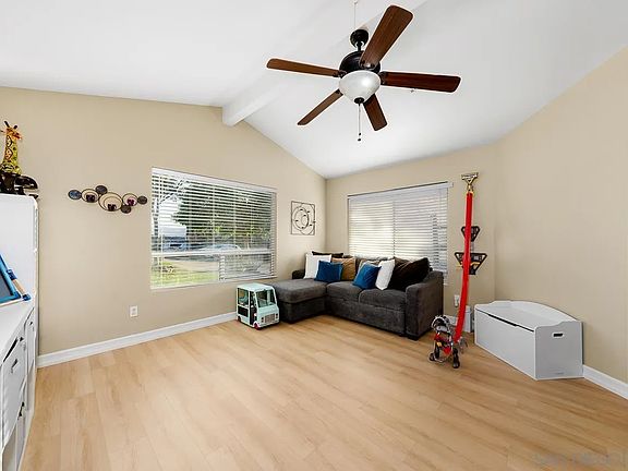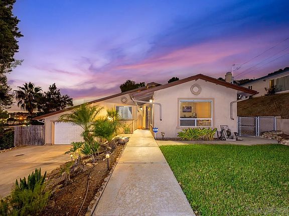 Welcome to 8708 Calle Sierra—a captivating 3-bedroom, 2-bathroom home offering 1,599 sq. ft. of living space on a 9,886 sq. ft. corner lot. Step inside to discover soaring vaulted ceilings that create an open, airy ambiance throughout. The spacious primary suite features a private ensuite bath, while the versatile front room can serve as a playroom, movie room, or office. The heart of the home is the kitchen, which seamlessly opens to the living room, ideal for family gatherings. Wood floors flow throughout, adding warmth and charm to the space. Outside, enjoy the beautifully designed backyard featuring low-maintenance astroturf and a relaxing jacuzzi, perfect for unwinding after a long day. The expansive deck offers stunning sunset views, ideal for entertaining. Practical upgrades include a newer A/C and furnace, a newer roof, and Tesla leased solar panels to keep energy costs in check. With direct garage access, spacious front and back yards, and a location on a peaceful street, this home offers both tranquility and convenience, just minutes from the freeway. Don’t miss this Spring Valley gem!