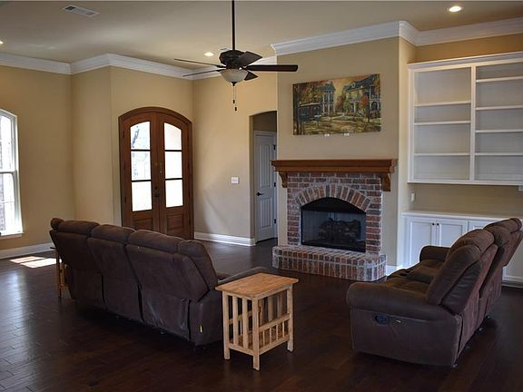 Solid construction in this Country Club Estates home with four bedrooms in three separate bedroom areas. Large open living room with fireplace and big windows viewing covered rear patio and privacy fenced backyard that is oasis. Huge kitchen with granite and stainless appliances with dining area and eat in bar. Primary suite has whirlpool tub, separate shower, two sinks and a massive walk in closet. Two bedrooms and full bath off the living room. Guest bedroom and full bath off kitchen. Tall ceilings and custom features throughout this house with neutral earth tone colors. Back yard has a waterfall flowing into a shallow river with sandy beach inside the loop. Swings and zip line keep youngsters entertained. Utility room between kitchen and two car garage. On demand hot water. City electricity, water, sewer. Atmos Energy natural gas. Separate storage building for lawn equipment. Move in ready and beautiful home.