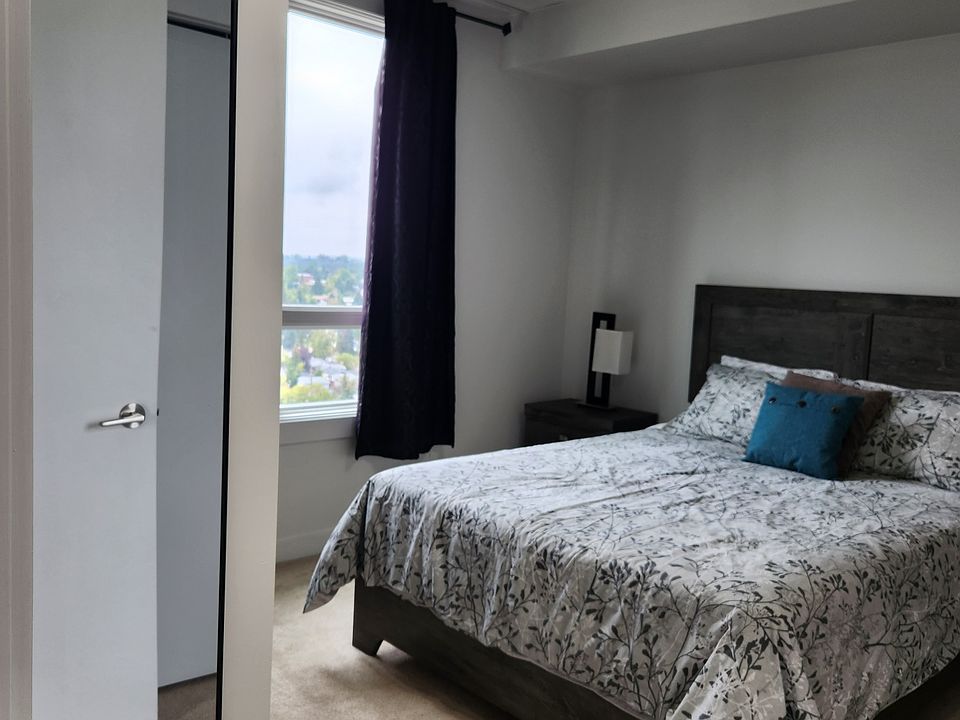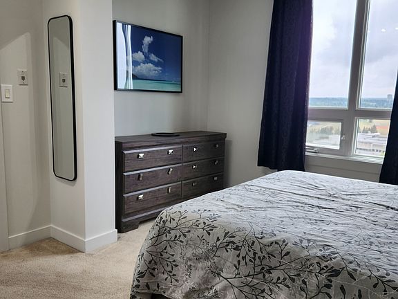 This bright and impeccable suite will impress you with the breathtaking city views from the fabulous balcony and you'll enjoy the natural light that warms the suite from the floor to ceiling windows. The open-concept design allows the beautiful space to flow seamlessly together. The upgraded kitchen features quartz counter tops, modern dark cabinetry, black appliances and is fully equipped to cook your meals. The primary bedroom features a queen size bed, complete with bedding and your own ensuite with a large walk-in shower. Your second bedroom provides versatility, whether it be for family, guests or a home office. Finishing off your suite you'll discover the 4-piece bathroom and the convenience of your own IN-SUITE LAUNDRY.