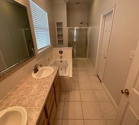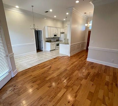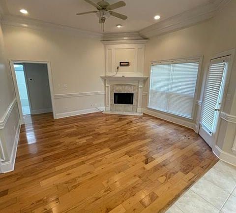 Large yardTall ceilingsJacuzzi tubCrown moldingFreshly painted interiorHardwood flooring