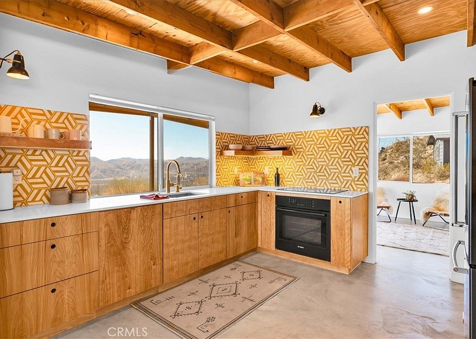 Step inside this sun-drenched retreat, where a spacious layout features two well-appointed bedrooms, each designed as a cozy haven to unwind and rejuvenate. The exposed beams throughout amplify the home’s rustic charm, creating a warm and inviting ambiance. The living room serves as the heart of the home, centered around a welcoming wood-burning stove—perfect for those chilly desert nights—as well as a projector for movie nights, allowing for a unique cinematic experience under the stars.