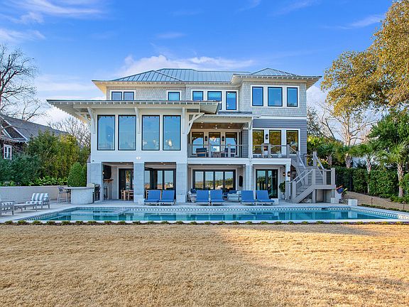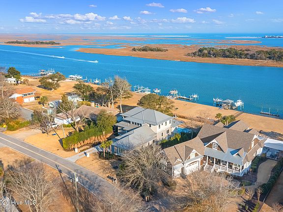 Welcome to 'Joywater', a stunning home with a resort-like feel directly on the Intracoastal Waterway. The interior and exterior areas of the property showcase views of Figure Eight Island, Lea-Hutaff Island, and out Rich Inlet to the Atlantic Ocean. Just a stone's throw away lies the prestigious Eagle Point Golf Club as well as Porters Neck Country Club, both Tom Fazio designed Championship golf courses. This custom designed home was completed in 2022 and built into the high bluff of Bald Eagle Lane up and out of the flood zone. The residence features views of the waterfront upon entering the gracious foyer. The chef's kitchen is centered around a 12-foot white pearl quartzite island with rift-cut oak cabinets, beverage center, walk-in pantry, and the finest handmade Zellige tile. A main level primary suite offers more custom tile work and cerused oak wood. The family gathering area overlooks both the pool and the waterway, giving one the sense of floating with its vaulted ceiling, enormous impact-rated Marvin windows and double height fireplace. Ascending to the upper level you will find another sitting area, a second primary suite, family suite, and an en-suite study with oak paneling, built-in cabinets, and solid paneled wooden barn doors. All the lighting and audio visual systems are state of the art for form and function. The lower-level includes more living areas, a secondary kitchen/bar and spa bathroom, plus another en-suite bedroom with walk-out access to the pool. The ground level also showcases a 1,000-bottle wine cellar and tasting room, lined with pecky cypress wood and reclaimed mahogany. Take your beverage of choice and head out the two 15 and 25-foot Centor folding doors onto the pool deck. There you will find an outdoor fireplace and grill station with a seated bar as well as under-cover and open-air lounging and dining areas. Of note is the standing seam metal roof framed by large and beautifully hand-made solid wood brackets, timbers, rafters and eaves. The exterior walkways, pool coping, and other surfaces display sandblasted limestone and marble slabs with more incredible craftsmanship. Beyond the 48-foot heated pool with sun shelf and spa is a two-tiered landscape with retaining wall and a second expansive lawn area. For boat lovers, the crowning glory just might be the waters-edge which leads out to a newly constructed bulkhead and pier with a large gazebo, 40' floating section, and 2 boat lifts with true deepwater access (one 13,000 lb and another 10,000 lb lift) . Schedule your showing today.