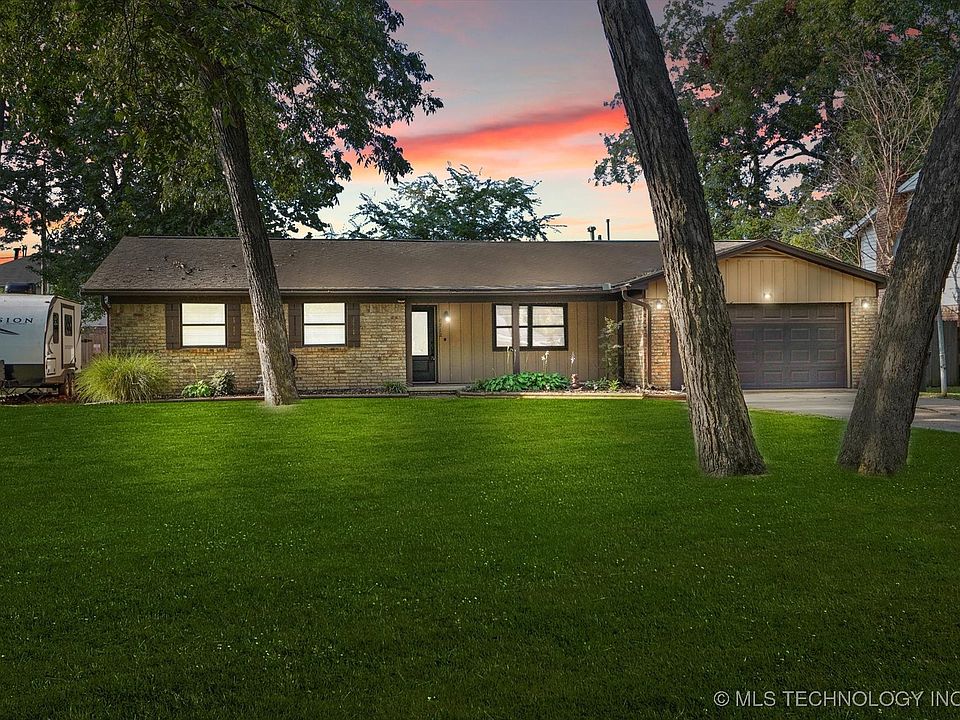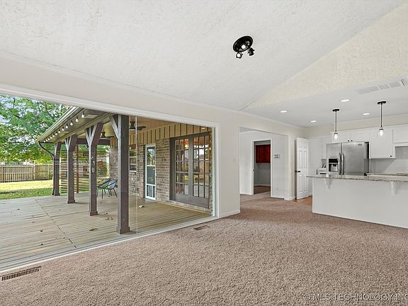 Welcome home to this charming full brick, single-story Ranch-style home is on almost a half-acre lot. You'll love the front porch and back patio, and it's on an end street with walking trails right there! Plus it's very close proximity to shopping and some great restaurants, one restaurant at the other end of the street! Highlights include a newer roof, brand-new carpeting throughout, and fresh interior paint throughout much of the home. The kitchen has beautiful granite countertops and stainless steel appliances, with the added bonus of a refrigerator that stays! Step out onto the large and amazing deck off the patio, perfect for relaxation and entertaining. Enjoy large stunning floor-to-ceiling windows in the front living room, which invite abundant natural light and seamlessly blend indoor and outdoor spaces. You absolutely have to see this to enjoy it! The cozy den features a fireplace and built-in bookshelves, while an office or flex room adjacent to the kitchen offers versatility for your needs. The master bath is updated and beautiful. Plus, this home is situated within the highly regarded Bixby North School District.