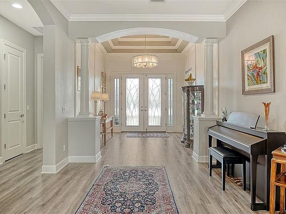 An Elegant Gem is the best way to describe this stunning 4-bedroom, 3-bath executive pool home in the boutique gated community of Cobblestone. As the largest and only 4-bedroom Pallazio floor plan currently available, this meticulously maintained residence offers over 3,200 sq. ft. of stylish, one-level living space with a grand double-door front entry. Situated on a wide waterfront lot with desirable southern exposure, you will enjoy breathtaking sunsets from your private oasis. This home is perfectly located on a quiet cul-de-sac with low taxes, offering the ultimate blend of privacy and convenience. Luxurious Interior Highlights: Spacious Living: 4 large bedrooms, 3 full baths, plus a dedicated den. Gourmet Kitchen: A beautiful white kitchen featuring an extra-large quartz island and premium stainless steel appliances, including a Bosch refrigerator and Bosch dishwasher. Designer Finishes: Captivating light-filled design with Level 5 wood-look laminate flooring, custom millwork, tray ceilings, and elegant crown moldings. Custom Details: High-end window coverings including white plantation shutters and roll-down shades, plus custom closets throughout for maximum organization. Included Extras: All flat-screen TVs, a brand-new washer and dryer, and an additional refrigerator/freezer in the garage are included. Outdoor & Tech Upgrades: Private Retreat: Custom heated saltwater pool with a brand-new pump and heater. Expansive Lanai: Travertine-tiled outdoor space featuring a built-in fire pit, oversized enclosure, and hurricane storm screens for peace of mind. Safety & Efficiency: Equipped with a WHOLE HOUSE GENERATOR, all HURRICANE-IMPACT RESISTANT WINDOWS AND DOORS, and a tankless water heater. Ample Parking: A 3-car tandem garage and widened driveway add functional luxury. Model-perfect and move-in ready—just unpack and enjoy! Cobblestone is an Esplanade community offering true resort-style living with a clubhouse, fitness center, pool with lap lanes, pickleball, playground for the kids and a full-time lifestyle manager.Just minutes from the Legacy Trail and Siesta Key Beach. Schedule your showing today to experience one of Sarasota’s most sought-after communities!