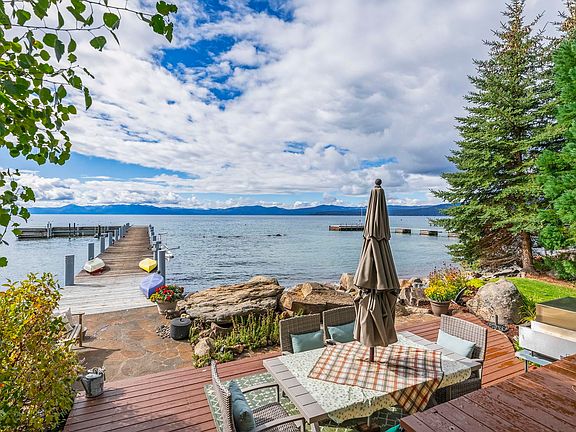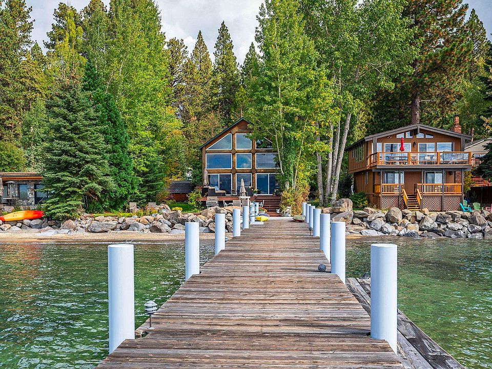 Experience the rare combination of classic Tahoe character, thoughtful craftsmanship, and direct lake access across two contiguous parcels on Brockway Vista Avenue in Kings Beach. Set on a flat, south-facing lot with all-day sun and no road noise, this lakefront offering delivers an exceptional setting for year-round enjoyment. The primary residence at 8714 Brockway Vista has been thoughtfully remodeled, blending warmth and function with lake views from the main living spaces. Vaulted ceilings and floor-to-ceiling windows frame Tahoe’s signature blue horizon, while a hand-set stone fireplace anchors the great room with timeless mountain character. The kitchen features custom hickory cabinetry and premium appliances designed for effortless everyday living and gathering. A main-level bedroom with an adjacent full bath enhances accessibility, while additional bedrooms and a spacious family room upstairs provide room to relax and entertain. The adjoining parcel at 8712 Brockway Vista adds meaningful flexibility with a paved parking area, storage space, and attractive potential for future expansion. At the shoreline, owners enjoy access to a shared rock crib L-shaped pier with three slips and two buoys, offering a rare protected harbor that shields from prevailing winds—ideal for boating and lakefront living. A sand-bottom shoreline and easy water access complete this legacy opportunity.