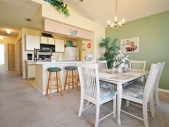 Spectacular front and rear views from this fully furnished 3/2, Disney-area, top floor condo. Meticulously maintained and tastefully decorated. Bright, airy and spacious floor plan with large picture windows and soaring ceilings. Everything stays including appliances! New A/C and thermostat 2017. Lots of extras including queen sleeper sofa, Disney-themed decorations and private, tranquil pond view off the master bedroom balcony - perfect for enjoying the warm Florida sunshine and frequent wildlife visitors! Top floor units are preferred by renters because you don't have noisy neighbors stomping around above you. The Villas at Island Club is a highly desirable, gated community located just minutes from theme parks, shopping, restaurants, golf courses, outlet stores, hospitals, bus lines and just about everything else one might need. Amenities include tennis & volleyball courts, shuffleboard, fitness room, sandy playground and picnic area. Low property taxes and a reasonable HOA fee help make this community one of the most affordable to own in. Location and special zoning also make it perfect for investors looking to generate rental income when not in personal use. Roof and patio deck covered by HOA and replaced approx 3 yrs ago. Units this nice are rare and this one is priced to sell - Don't put off seeing it!!