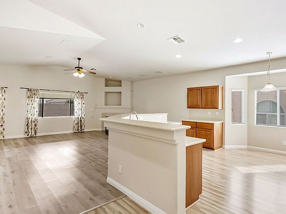 Beautiful, well kept single story home, in gated Southwest community; Inviting covered front porch; MM wood flooring entry, walk area & kitchen with Luxury vinyl plank flo0ring throughout the rest of the home; Formal living/dining room; Separate family room w/ ceiling fan, light, surround sound speakers, and cozy fireplace; Island kitchen w/ solid surface countertops, Double built in oven, cook top stove, microwave, refrigerator, built in desk & pantry; Primary suite with ceiling fan, light, cable outlet, door to patio, jet tub, separate shower, and large walk in closet; Guest beds all w/ ceiling fans, lights & cable outlets; Laundry w/ sink & cabinets; 3 car garage with auto opener and entry to the house; Full length covered patio with easy care desert landscaping; Convenient to the Southern 215, shopping, dining and much more; Clean and ready for you to move in!