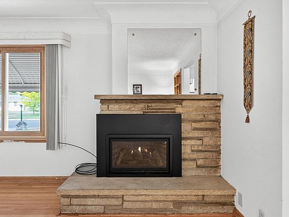 The heart of the home is a generously sized living room featuring original hardwood floors, a classic gas fireplace, and an informal dining area-ideal for entertaining or relaxing with family and friends. Large updated windows flood the space with natural light, highlighting the warmth of the original woodwork throughout the main floor. An updated eat-in kitchen provides plenty of space for casual meals, with modern finishes that complement the home's classic design. The main floor also includes three bedrooms, including a walk-through third bedroom-common for the era-ideal for use as an office, guest room, or nursery. The full bathroom retains its original mid-century style, complete with a rare double-sink vanity. Downstairs, the lower-level family room offers even more living space and features a second fireplace-this one wood-burning-perfect for cozy Minnesota evenings. Additional highlights include a two-year-old roof, updated windows, and an enclosed