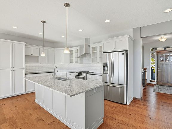 This custom Gordon Finch home offers quality craftsmanship, thoughtful design, low-maintenance living & breathtaking views. Inside this 4 bedroom/3 bath home you’ll find 9ft ceilings, hickory hardwood floors throughout, two large composite decks (hello, exquisite sunrises & sunsets!), and a kitchen w/ both granite & quartz counters. The main floor also includes a luxurious primary suite w/ a walk-in tile shower & a generous sized closet. The fully-finished daylight basement features 2 additional bedrooms, a large second living space w/ a gas fireplace, plumbing for a future wet bar, and a walk-out deck. Outside, you’ll find privacy & very low-maintenance landscaping, complete w/ a drip system - no lawn care required! Additional features include a new water softener (Nov 2024), an oversized/insulated/heated 4-car garage, true no-step entry with curb removal for accessibility, and Hunter Douglas shades throughout. This home is ideal for those seeking a meticulous, easy-living, high quality home.