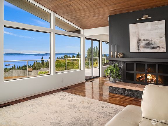Sweeping Northwestern views of Whidbey & Sound from this 4-bed Seaview home complete w/ its own private pool for Summer lounging w/ a view. Great room soars w/ vaulted, wood-beamed ceilings, and dramatic gallery windows framing the panoramic views. Wood-burning fireplace adds ambiance. Step onto the wraparound view deck & enjoy sunsets & seamless entertaining. Formal dining w/ built-in buffet/cabs. Kitchen boasts black granite, cherry shaker cabs, SS apps, garden window, & informal dining nook. Take in the views. Hardwoods on main. 3 beds up incl. spacious Primary Suite w/ WIC. 1 bed down. Laundry rm w/ ample storage. Lower level rec-rm w/ 2nd wood fireplace & office. Storage shed. 2-car front garage + rear garage perfect for toys.
