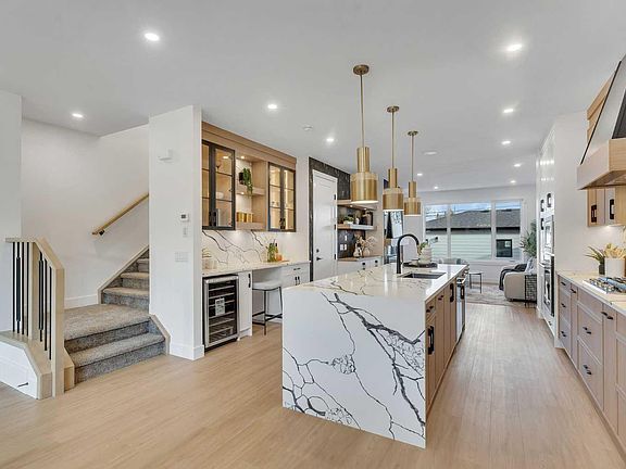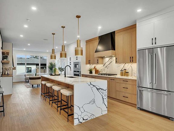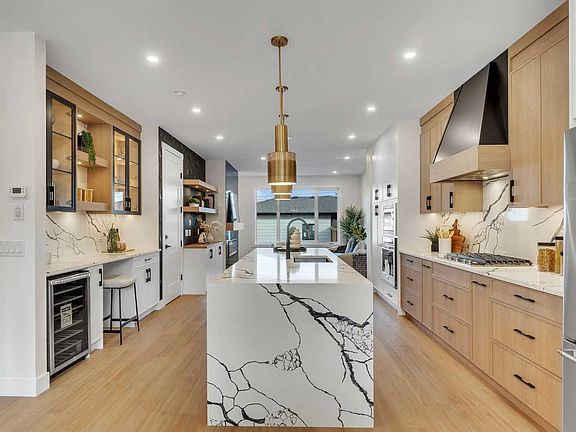 Gourmet kitchenStainless steel kitchenaid packageDouble-door fridge with waterlineCustom canopy hood fanQuartz countersUnder-cabinet lightingCustom cabinetry