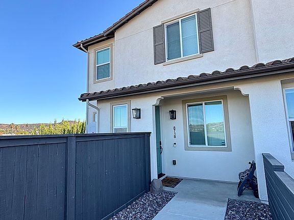 Two-story, end-unit townhome located in West Santee. Solar, energy efficent home built in 2021. Beautiful mountain views from every room. 3 bedrooms plus loft. Open floorplan with 9ft ceilings. Stunning kitchen with quartz countertops and large center island. Private, fully fenced backyard. Master bedroom with two walk-in closets. Master bathroom with shower and soaking tub. Second floor laundry room. Well maintained community with BBQ, corn hole, and picnic tables. Minutes from the 125/52 freeways.