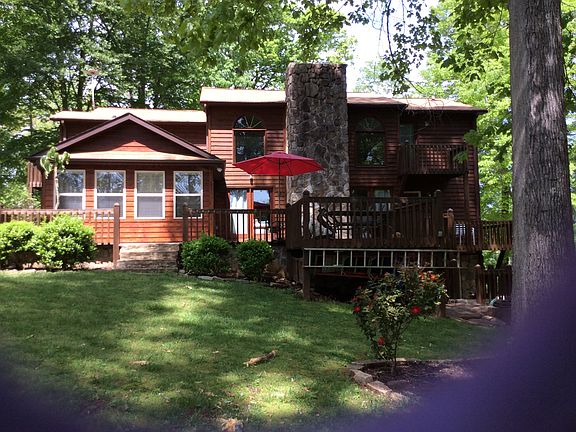 Custom built home, stone and cedar siding. Large front porch and concrete patio with decking around back and side of home. Two small decks upstairs out of library and tv room. Large eat in kitchen, Open two story great room with open dinning room. 16 x20 sunroom. Master on main with jacuzzi tub and walk in shower, spiral stairs up to library in Master. Upstairs has 2 Large bedrooms up each with on-suite baths. TV room and library. All on private road on over 2 acres of land.