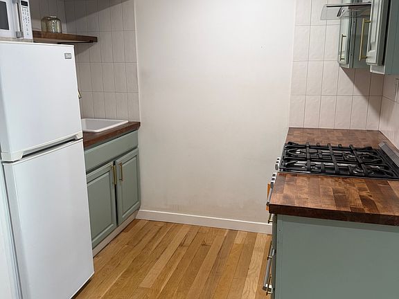 The kitchen with a Fridge, microwave, and brand new stove that features wall wall-mount fan above. Also, including a pantry closet.