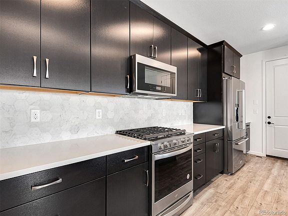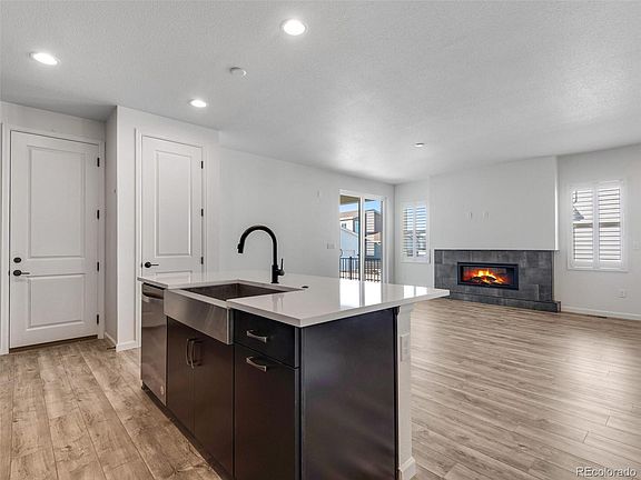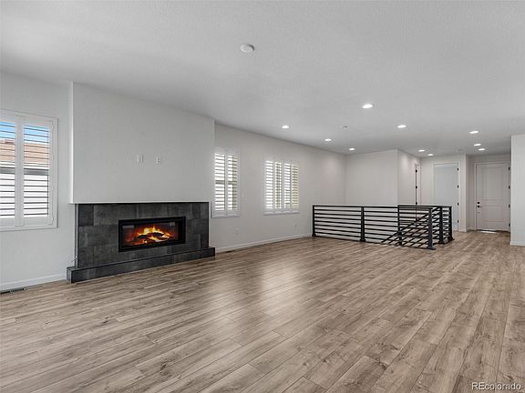Move-in ready. Great curb appeal with the popular mid-century modern style architecture. The kitchen features KitchenAid counter depth fridge, Whirlpool gas range, microwave, dishwasher, dark flat panel espresso cabinets, quartz countertops and stainless steel farmhouse style sink. Open great room with a fireplace, siding glass doors that lead to the covered patio and contemporary horizontal stair railing to the finished basement. Grey wood colored plank flooring throughout most of the main level. Spacious primary bedroom suite with large shower and walk-in closet. Additional features include, full basement with a finished rec room, bedroom and bathroom, professionally landscaped front yard, tankless water heater and home technology package.  Located in the amenity rich community of Sterling Ranch! Sterling Ranch boasts 30 miles of trails, prolific open space, educational gardens, town center, civic center, recreation center with pool, clubhouse and fitness center, plus so much more! Instead of a traditional HOA, Sterling Ranch has a Community Authority Board (CAB) that operates like an HOA. The majority of the community costs are paid through property taxes, however, please visit the Sterling Ranch CAB website for retailed information on the additional quarterly and monthly fees (https://sterlingranchcab.com/). Taxes are TBD and have not been assessed yet for this home. Est. annual taxes are shown at approx. 1.22% of the purchase price.