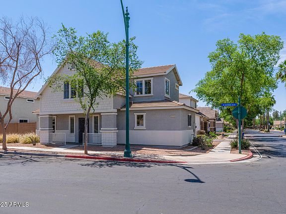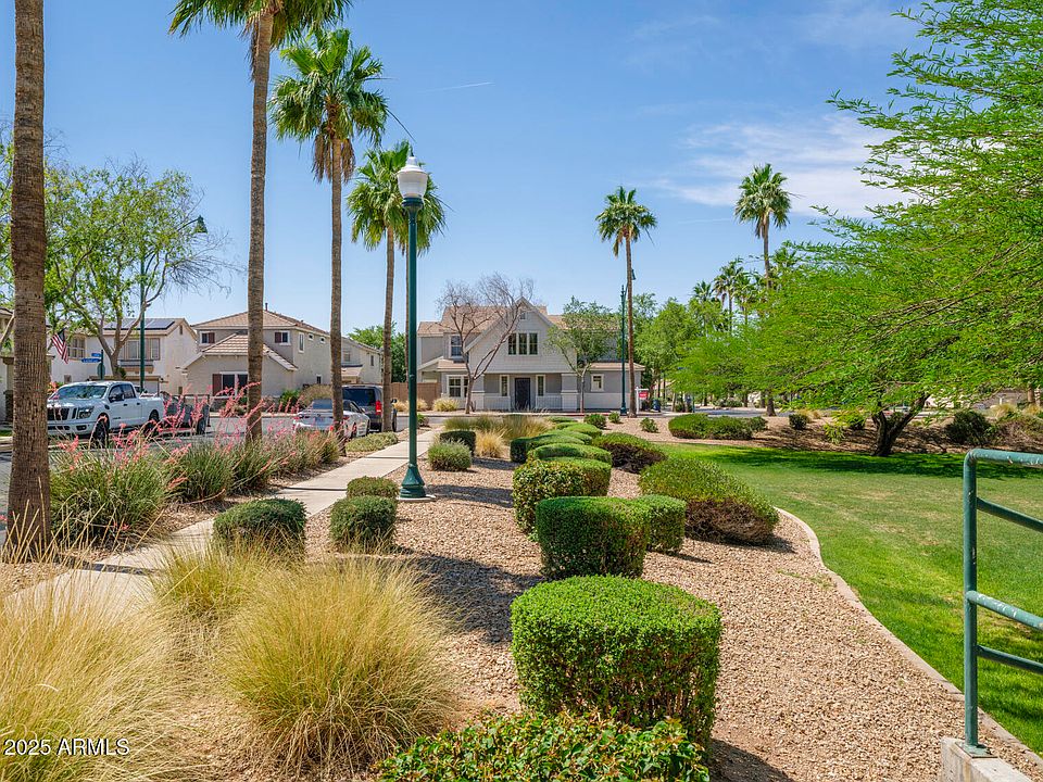PRICED BELOW MARKET COMPS!!! Best VALUE $203/sq ft! Apx 2100 sq ft, 3 BR, 2.5 BA , 2G w/ built-ins. Pebble Sheen POOL w/ waterfall, covered patio! Darling front porch directly across the street from 1 of 3 PARKS in this GATED community. Truly a rare find~instant equity. Gilbert School Dist Premium N/S corner lot overlooks the greenbelt & manicured grassy areas (playground at other park). A/C replaced 2019! Upgraded kitchen..granite, 5 burner gas stove, large pantry, SS appliances. Generous size dining/family rm w/ 2-way gas fireplace. Front room boasts vaulted ceiling, custom security door, fans t/o. Spacious bedrooms and HUGE closets. See items updated! New tub in hall bath! Primary offers walk-in, large soaking tub, dual sinks. Lots of storage. What a STEAL!