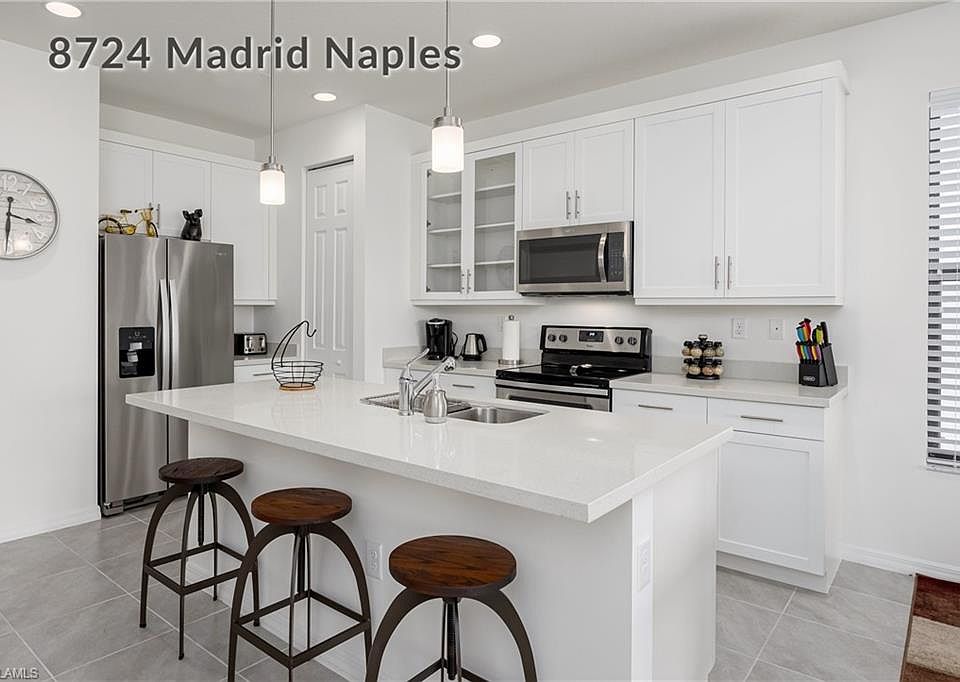 MODERN MADRID CIRCLE! Welcome to 8724 Madrid Circle, a luxurious newly built modern home with extraordinary finishes and clean lines offering you the very best in one level open concept living! A close drive to famous Olde Naples, the renowned shopping and dining district of 5th Ave and 3rd Street South, pristine white sand beaches and the Naples Pier this detached single family home is loaded with high end finishes and custom details. Select premium upgraded finishes include, QUARTZ COUNTERS in kitchen and bathrooms, sleek white shaker cabinets throughout, stainless steel appliances, NEW UPGRADED FRAMELESS SHOWER DOORS IN BOTH BATHROOMS (DONE AFTER CLOSING), NEW WOOD LOOK TILE IN ALL BEDROOMS (DONE AFTER CLOSING) and ALL NEW FANS AND CUSTOM LIGHTING FIXTURES THROUGHOUT (DONE AFTER CLOSING). A PREMIUM LAKE VIEW, brick paver driveway, tile roof and lush landscaping finish things off making this the perfect home for you. FURNISHINGS ARE NEW, AMAZING AND NEGOTIABLE! Fronterra features a sparkling community pool and covered outdoor dining area for your enjoyment. SUPER LOW COMMUNITY FEES of $95/month! Call for your private showing today!