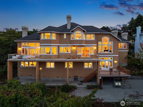 Perched above Lake Washington in highly desirable Inverness neighborhood, this NW contemporary residence showcases stunning panoramic views from nearly every room. Sunlight fills open-concept living spaces through expansive floor-to-ceiling windows & soaring ceilings. Timeless layout flows from elegant living room to formal dining room. Gourmet kitchen opens to spacious family room. Upstairs, luxurious primary suite & additional en-suite bedroom. Lower level offers generous bonus room, 3 view-filled bedrooms & 2 more baths. Extensive millwork & built-ins throughout. Enjoy expansive view decks & low-maintenance private backyard. Dual-zone HVAC, 5 gas fireplaces & 3-car garage. Close to B-G Trail, parks, Seattle Children’s, U Village & UW.