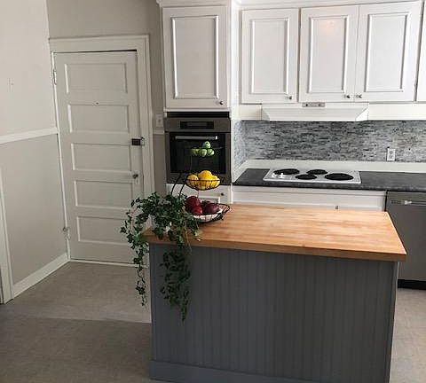 Built in kitchen islandRoom for eating spaceBay windowCountry style front porch
