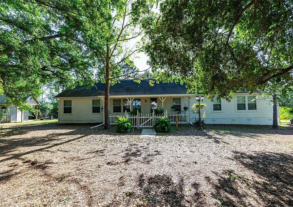 Welcome to country living at it's finest. This lovely 4BR/2BA modular home is situated on just under 5 acres, fenced on three sides surrounded by oaks, palms and citrus trees. What a perfect place to raise a family or retire to a beautiful, peaceful setting. This is a well, constructed home on a block foundation and Hardie Board siding. Enjoy the warm Florida breezes on your open 13x31 foot deck looking out at the beautiful expanse of your property. And if you already love the outside, you will definitely be pleased when you walk through the front door. Open concept as you enter the home between the living room, dining room and kitchen. The large kitchen with vinyl flooring, wood-faced cabinets, ceiling fan and walk-in pantry will please any chef with an abundance of cabinet and countertop space. Living room and dining room also have laminate flooring. A unique feature to the home is the large hallway which can double as office space. A large family room complete with wet bar and wood burning fireplace lends itself to relaxing evenings with family and friends and a great space to entertain during the holidays. The home features a split bedroom plan with the owner's retreat separate from the other three bedrooms. The primary bedroom has carpet, ceiling fan, large walk-in closet and ensuite bathroom with step-in shower and a garden tub. At the opposite end of the house, you'll find bedrooms 2-4. These rooms are all nice sized with carpet and proximity to the guest bathroom which has a tub/shower combo. The inside utility room is 9x6 and comes with the washer and dryer. There are many updates to this home including double-pane windows throughout, marble windowsills, 7/12 roof pitch with new gutters, 2020 AC, extra attic (R-30) insulation, deep well-200 ft, and new dishwasher in 2021. Schedule your appointment today so you can see in person what this beautiful property and home has to offer.